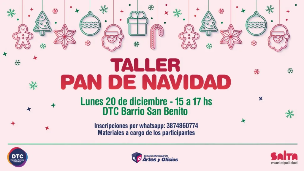 La Municipalidad de Salta acerca opciones de formación en distintos puntos de la ciudad. En esta oportunidad, a través de la Escuela de Artes y Oficios y, en conjunto con el Dispositivo Territorial Comunitario de barrio San Benito, se organizó para el lunes 20, de 15 a 17 horas, un taller de Pan de Navidad […]