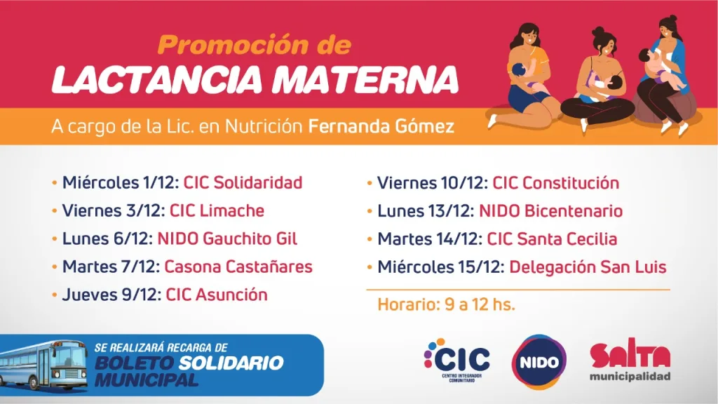 Como todos los meses la Municipalidad de Salta a través del programa de Boleto Solidario Municipal de la Secretaría de Desarrollo Humano realizará la promoción de la lactancia materna y la recarga del boleto solidario. Durante el mes de diciembre, el equipo de la Subsecretaría de Promoción Social, Inclusión y Discapacidad junto a la Subsecretaría […]