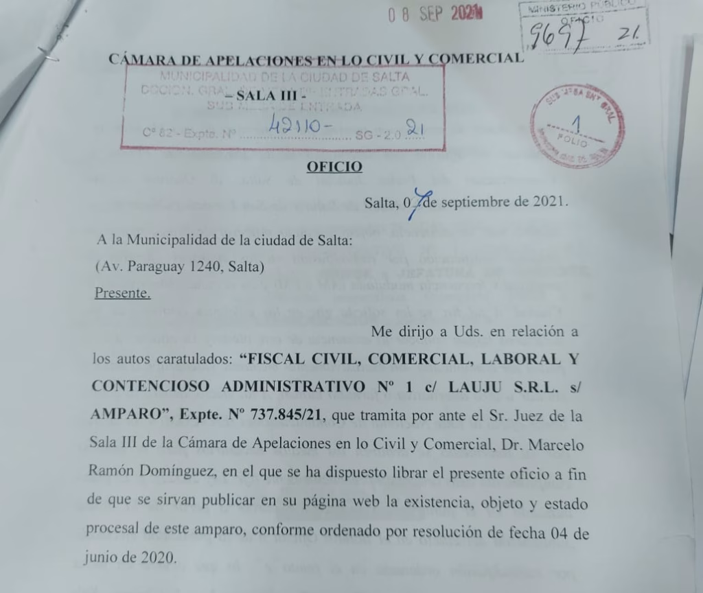 En relación a los autos caratulados: “FISCAL CIVIL, COMERCIAL, LABORAL Y CONTENCIOSO ADMINISTRATIVO Nº 1 c/LAUJU SRL s/AMPARO”, Expte. 737.845/21, que tramita por ante el Sr. Juez de la Sala III de la Cámara de Apelaciones en lo Civil y Comercial, Dr. Marcelo Ramón Domínguez, en lo que se ha dispuesto librar el presente oficio […]