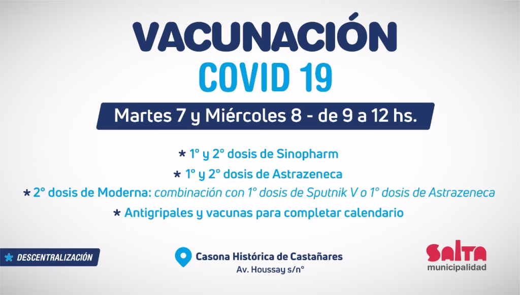 La Municipalidad de Salta realizará este martes 7 y miércoles 8 de septiembre jornadas de vacunación contra el Covid-19 en la zona Norte de la ciudad. La atención será en la Casona de Castañares, ubicada en Av. Houssay Bernardo Doctor S/N, en el horario de 9 a 12, por orden de llegada. La jornada será […]