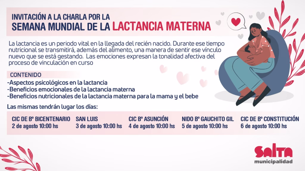Con motivo de conmemorarse a nivel mundial la Semana de la Lactancia Materna, la Subsecretaría de la Mujer de la Municipalidad realizará un conversatorio sobre “Lactancia y su influencia a nivel emocional” en los barrios. La actividad se desarrollará del 2 al 6 de agosto en los edificios municipales de los barrios Bicentenario, Asunción, Gauchito […]
