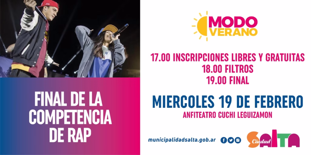Esta tarde, a las 19, se llevará a cabo la gran final de rap en el anfiteatro “Cuchi” Leguizamón del parque San Martín. Los primeros clasificados son “Demian”, “Fuser”, “Ginko” y “Tate”, quienes se destacaron en las batallas anteriores. A las 17, se abrirá la inscripción para todos aquellos que no pudieron participar en las […]