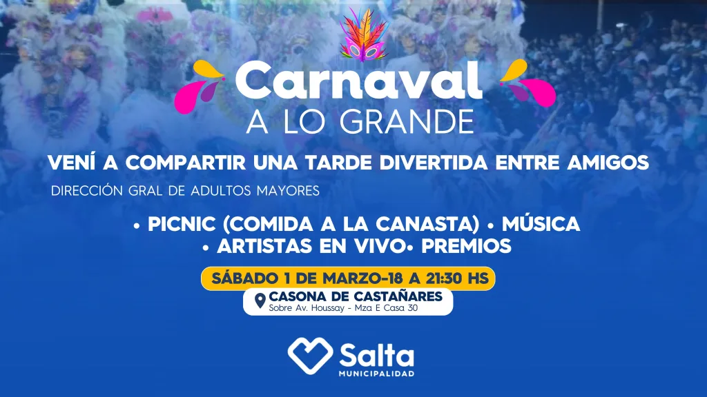 Para festejar el carnaval, el municipio invita a los adultos mayores a compartir una jornada de entretenimiento gratuita, en la zona norte de la ciudad. Será una comida a la canasta y habrá música, artistas en vivo y premios.