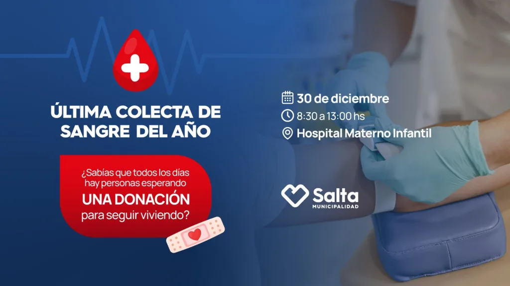 Quienes deseen donar sangre deben acercarse al hospital público Materno Infantil, Av. Sarmiento 301, el 30 de diciembre de 8.30 a 13 hs. Para donar hay que ser mayor de 16 años, pesar más de 50 kilos y gozar de buena salud.