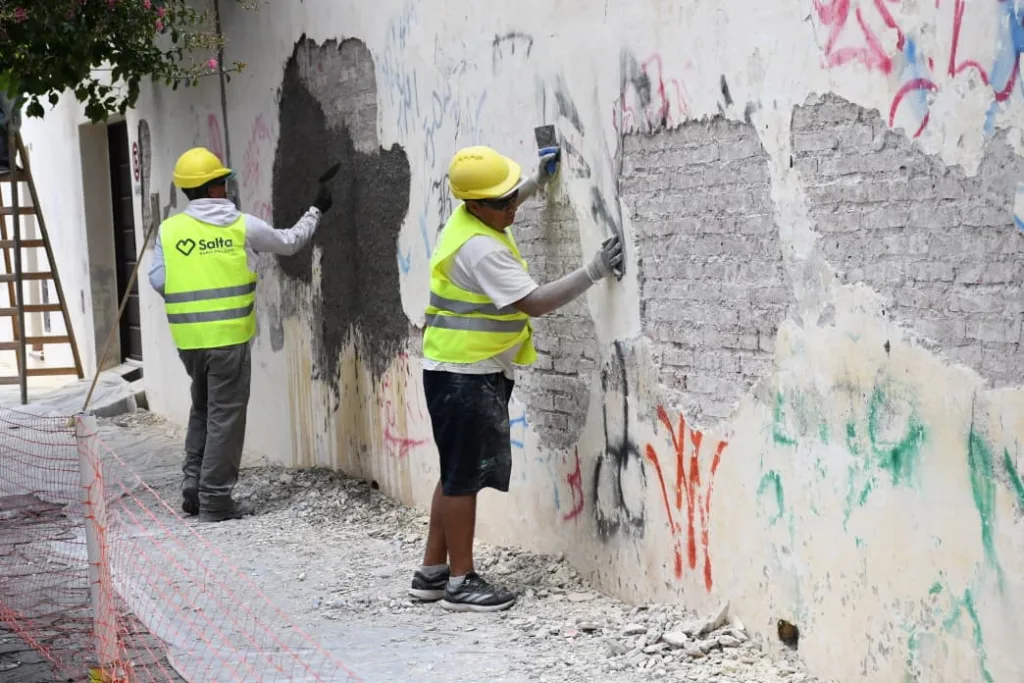 Los trabajos se realizan de manera conjunta entre la Municipalidad y la administración del templo religioso. Los trabajos iniciaron con la remoción del revoque dañado y la limpieza de los grafitis. Se solicita a los peatones circular con precaución y respetar las indicaciones.