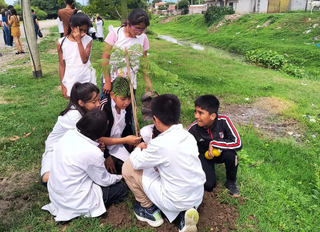 La jornada se realizó en el marco del plan de arbolado público y del programa “Reforestando mi ciudad” que lleva adelante la Municipalidad. Los ejemplares se colocaron en el margen del canal Juan XXIII, en las veredas de la escuela y en la plazoleta del lugar.
