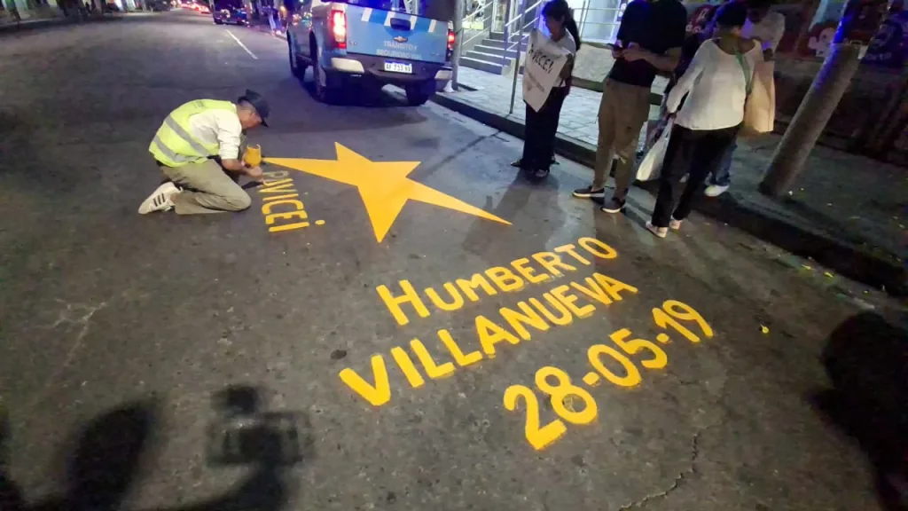 Personal municipal trabaja en la puesta a punto de la señalética en el pavimento que representa a las víctimas fatales en accidentes de tránsito. Este fin de semana, se trabajó en 2 puntos del microcentro. La acción es acompañada por miembros de Pavicei.