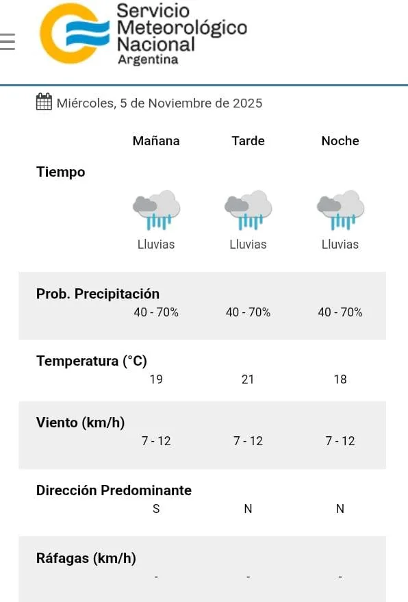Hoy amaneció con algo de viento y el pronóstico actualizado indica probabilidades de precipitaciones a lo largo del día. Para mañana jueves habría todavía algunas posibilidades de lluvias, aunque se espera que el tiempo mejore.