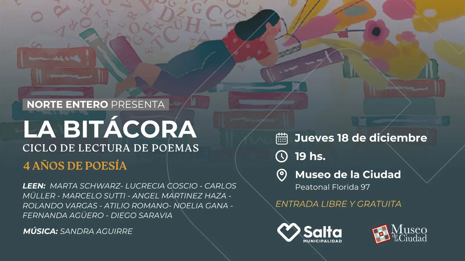 La Municipalidad de Salta, a través de la Agencia Cultura Activa, junto al colectivo de poetas “Norte Entero”, invita a la comunidad a participar del noveno encuentro del ciclo de lecturas de poesía “La Bitácora” en 2025, que marcará el cierre del año y celebrará cuatro años de continuidad del proyecto.