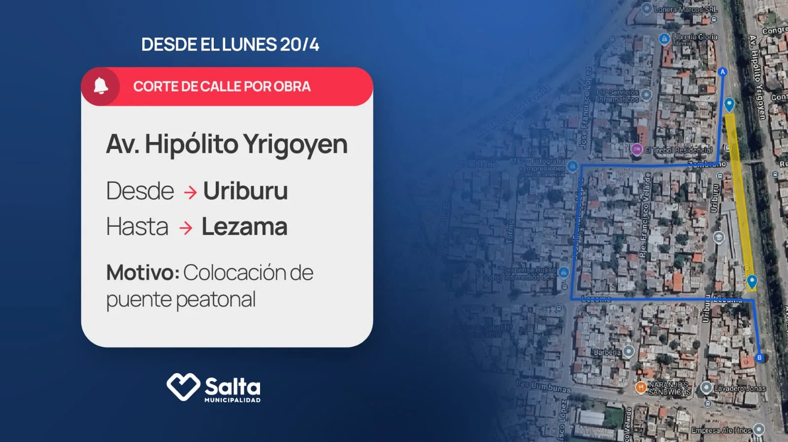 La Municipalidad de Salta informa que, a partir del lunes 20 de abril, habrá un corte de tránsito en Av. Yrigoyen por la instalación de un puente peatonal.