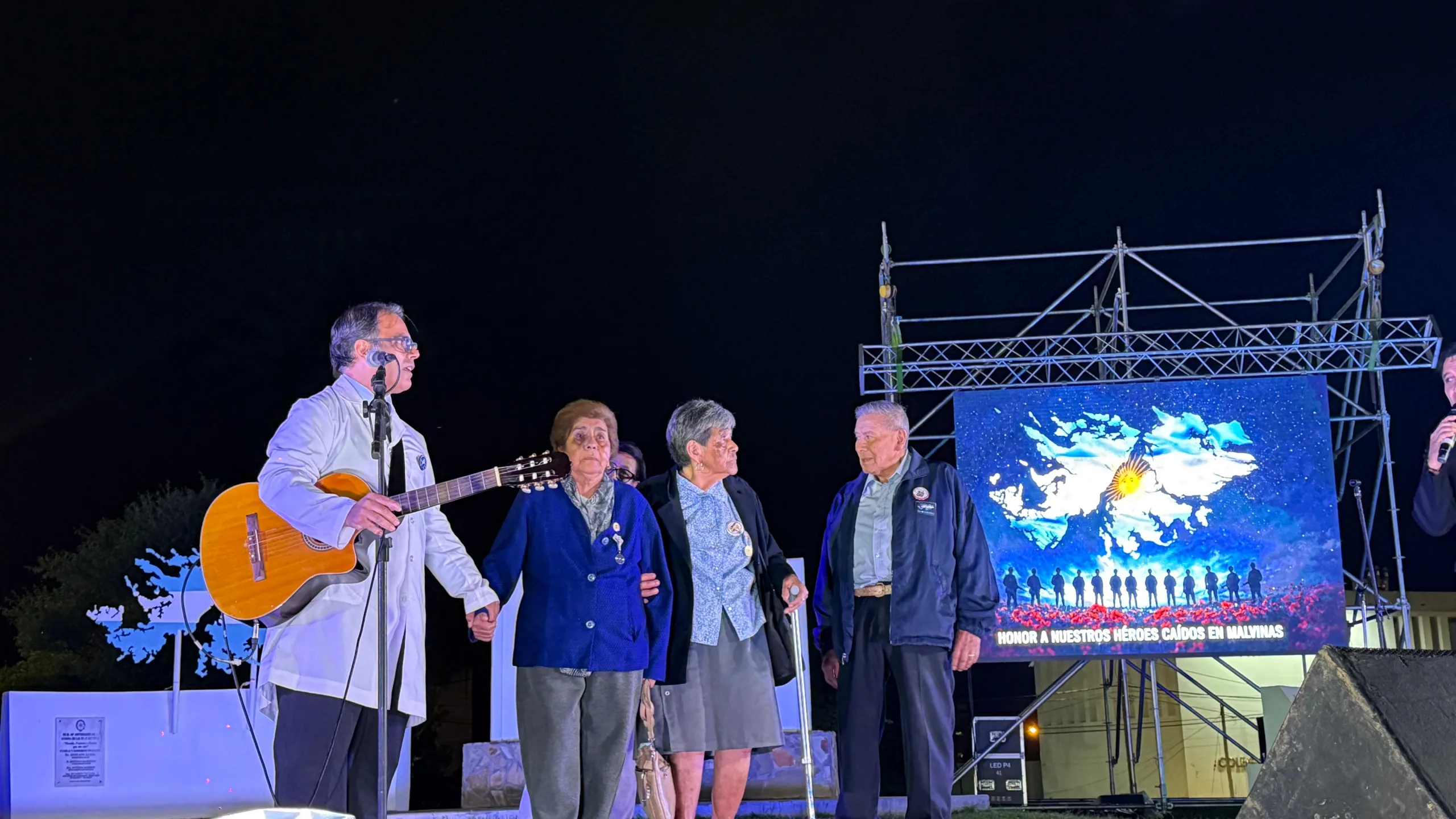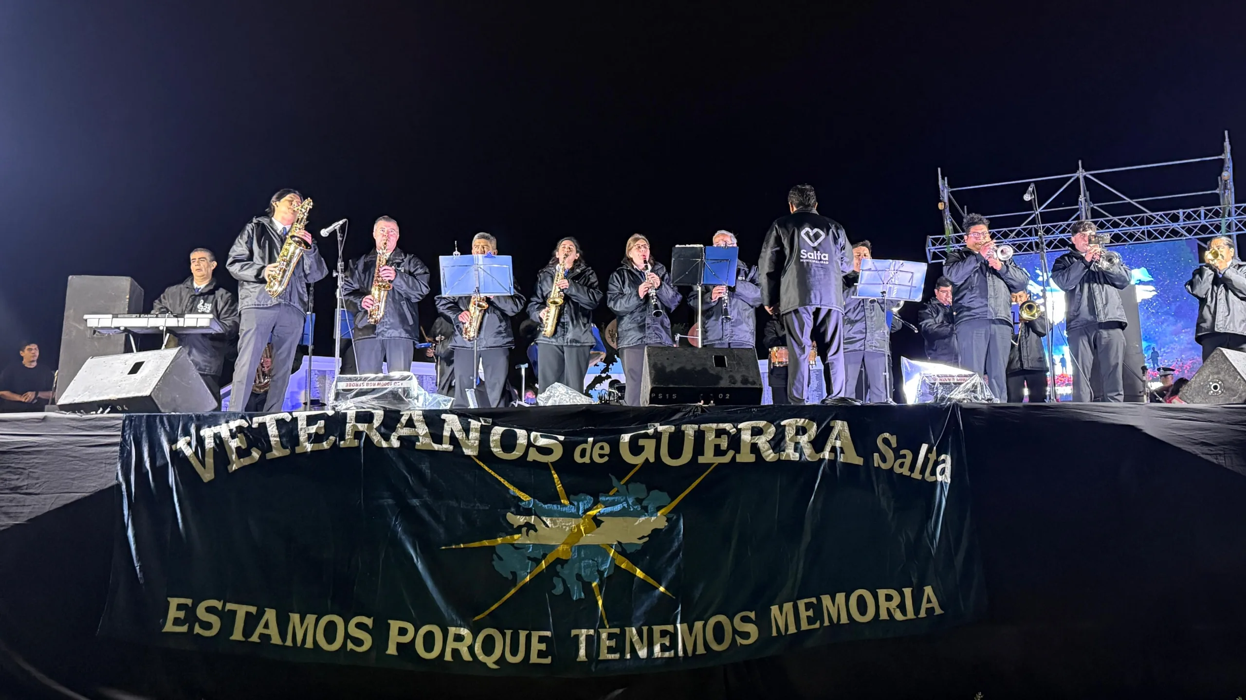 A las 23:30, la Banda del Ejército ofreció una retreta, seguida de un audiovisual homenaje realizado por el equipo de prensa de la Municipalidad. El cierre fue a viva voz con la entonación del Himno Nacional y de la Marcha de Malvinas, momentos que emocionaron a veteranos, familiares y vecinos reunidos.