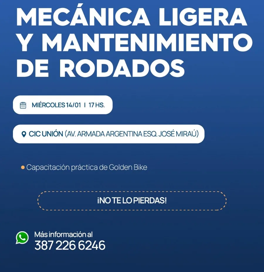 La Municipalidad junto a la empresa Goldenbike realizará un nuevo taller de “Mecánica ligera y mantenimiento de rodados”. Será el miércoles 14 de enero de 17 a 19 hs. en las instalaciones del CIC “Nuestra Señora del Carmen” de barrio Unión.
