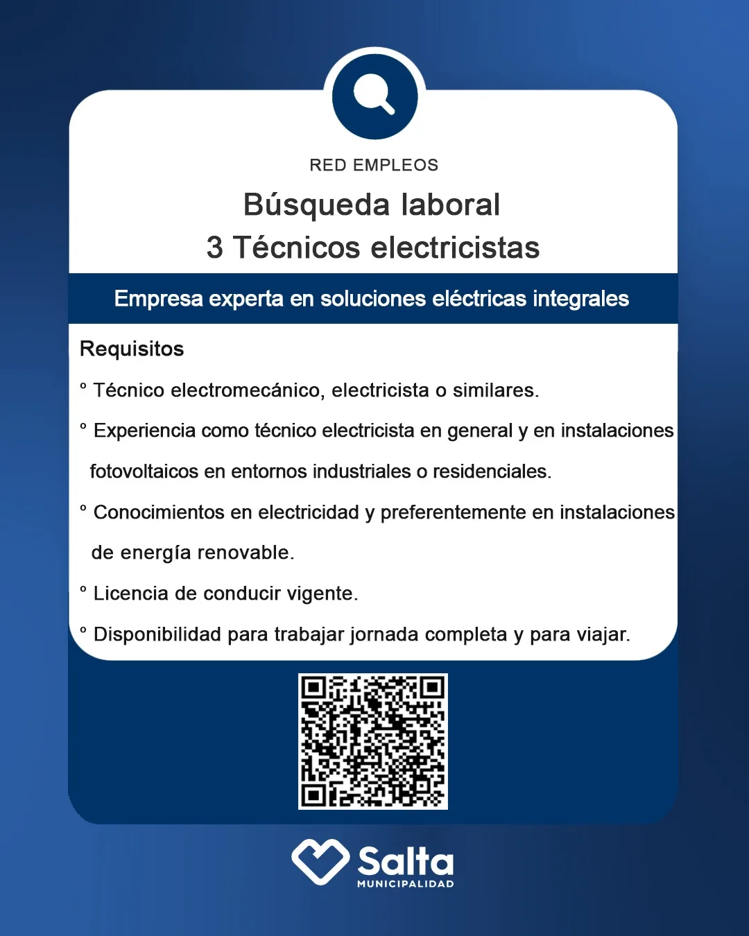 La Municipalidad de Salta, a través de Red Empleos, informa una nueva oportunidad laboral destinada a técnicos electricistas, impulsada por una empresa especializada en soluciones eléctricas integrales.