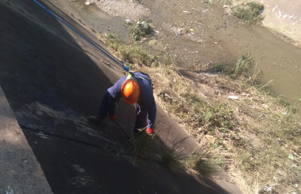 Los operarios realizan el desmalezado de las márgenes mediante el uso de arnés y sogas. Se destaca el rescate de un perro que había caído al desagüe.