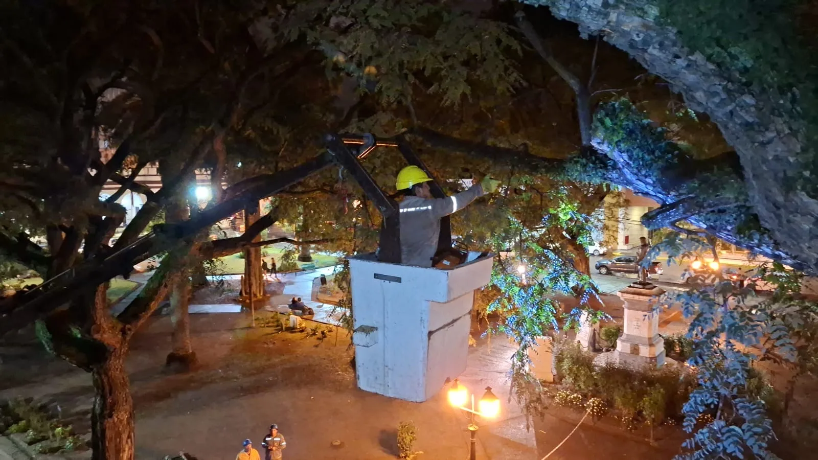 “El árbol es una tipa de gran tamaño y ya no puede sostenerse, por eso lo vamos a sacar completamente. Vamos a trabajar de esta manera para dejar la plaza como estaba, en buen estado y segura”, dijo Martín Miranda, secretario de Ambiente y Servicios Públicos, área que también trabaja en el operativo.