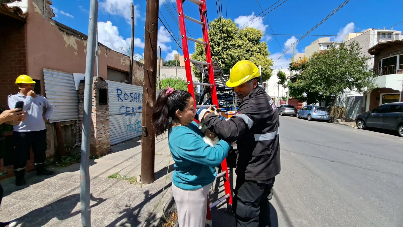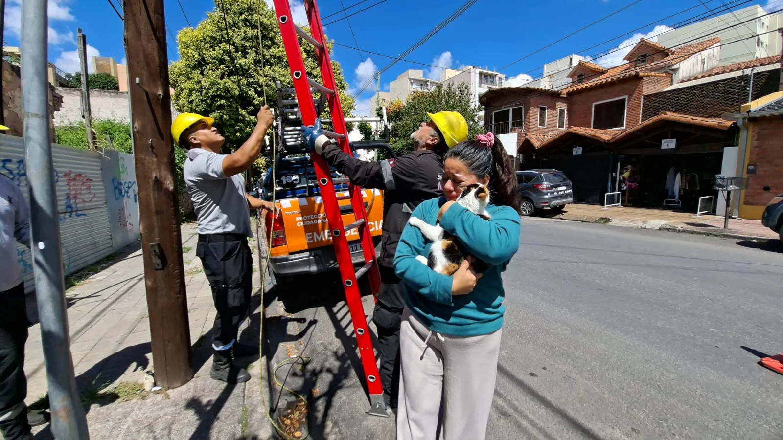 La felina se encontraba en un poste de alumbrado público y no podía bajar. El hecho ocurrió en Vicente López y O’ higgins, donde los trabajadores de la Subsecretaría de Protección Ciudadana actuaron de gran manera.