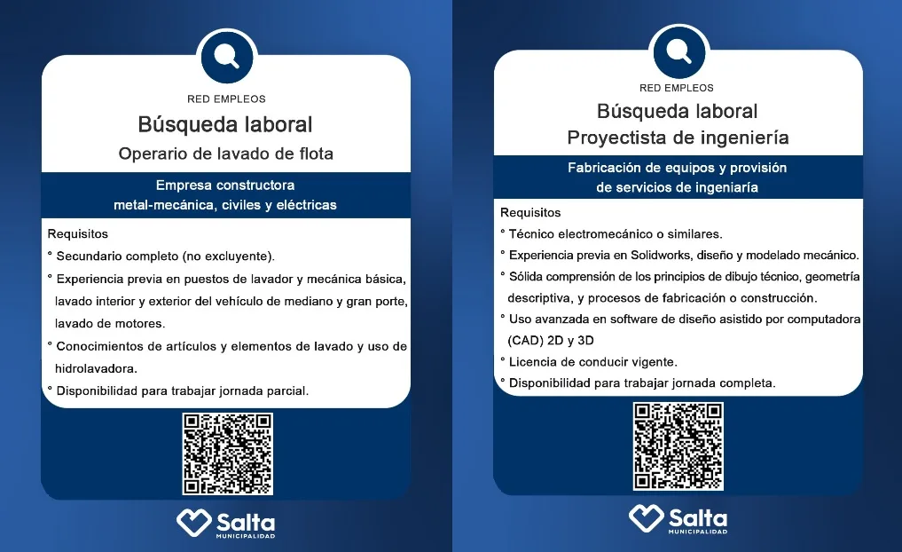 Los interesados pueden conocer más detalles y postularse escaneando los códigos QR disponibles en las publicaciones del Facebook oficial o acercándose a la Oficina de Empleo Municipal, en Independencia 910, donde se brinda acompañamiento y asesoramiento gratuito. También se encuentra disponible el número 3874263054.