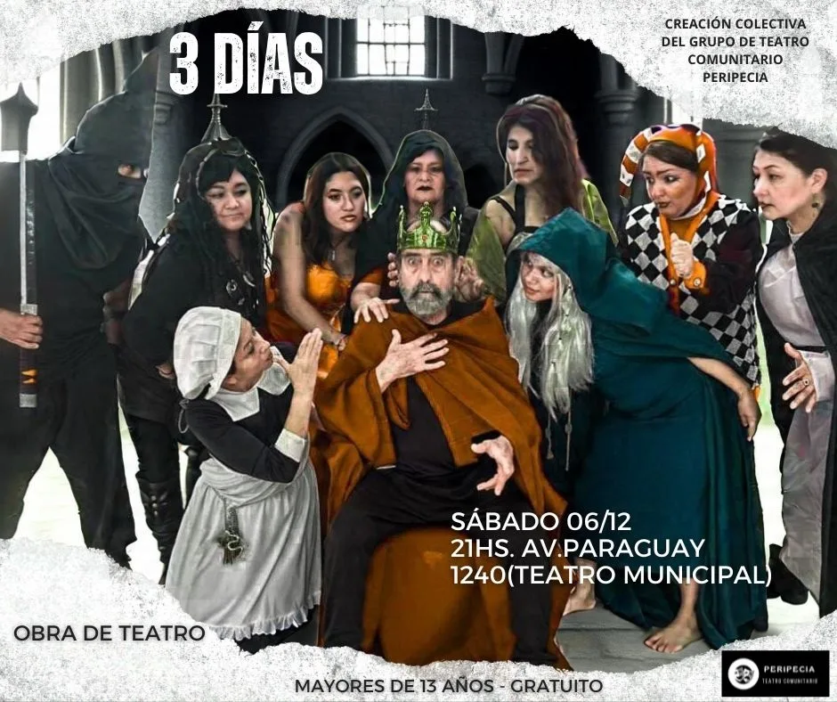 El sábado 6 de diciembre, a las 21 horas, el grupo de Teatro Comunitario Peripecia presentará su muestra final en el Teatro Municipal, ubicado en Av. Paraguay 1240, con entrada libre y gratuita.