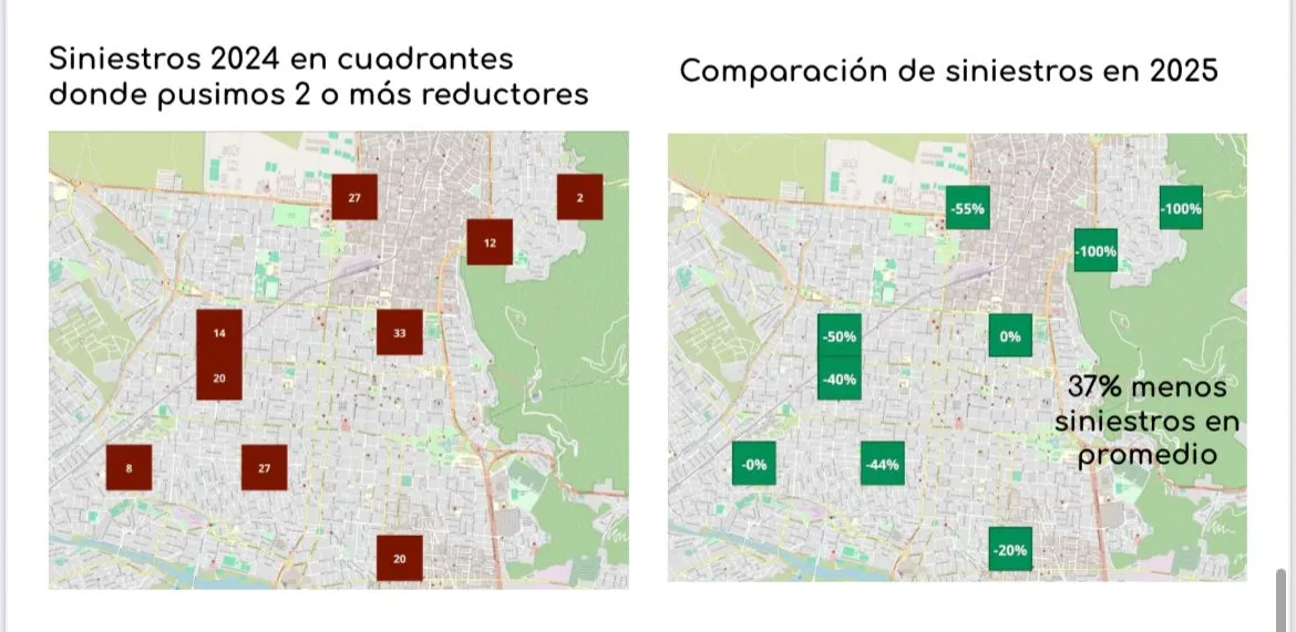 Por ejemplo, en Av. Arenales, precisamente en el ingreso a Popeye, se bajó un 55% los siniestros con la colocación de reductores. Desde que hay reductores en diferentes zonas de la ciudad, los accidentes en esos lugares disminuyeron un 37%.