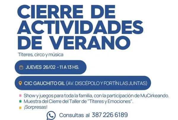 La propuesta de «Vacaciones en los CIC» edición verano finaliza con un gran cierre. Será el jueves 26 de febrero de 11 a 13 hs en el CIC de barrio Gauchito Gil, ubicado sobre Av. Discepolo y Fortin Las Juntas, zona sudeste.